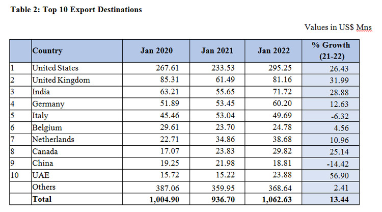 2022 ජනවාරි මාසයේ ශ්රී ලංකාවේ අපනයන කාර්යසාධනය
