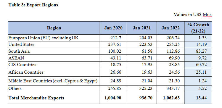 කලාපීය වශයෙන් සංසන්දනය කිරීමේදී 2021 ජනවාරි මාසයට සාපේක්ෂව 2022 ජනවාරි මාසය තුළ සියලුම කලාප වෙත ශ්රි ලංකාවේ අපනයන වැඩි වි ඇත.