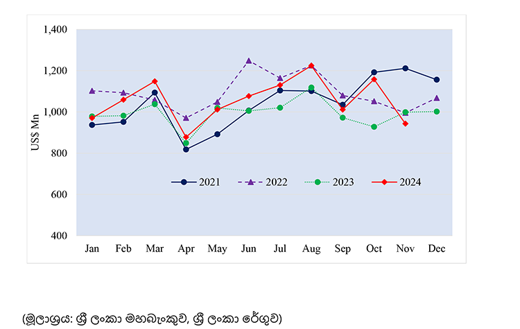 රූපය 1: මාසික වෙළඳ භාණ්ඩ අපනයන කාර්ය සාධනය 2021- නොවැම්බර් 2024