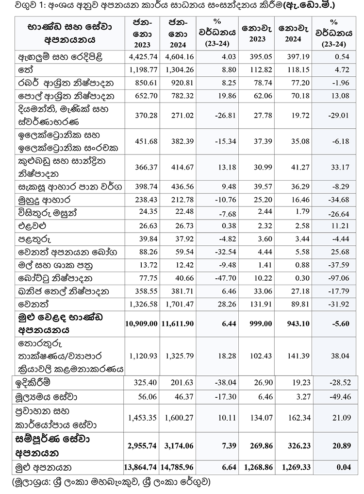 වෙළඳ භාණ්ඩ සහ සේවා යන දෙකම ඇතුළුව 2024 නොවැම්බර් මාසයේ සමස්ත අපනයනය එක්සත් ජනපද ඩොලර් මිලියන 1,269.33 ක් ලෙස වාර්තා වූ අතර එය 2023 දී එම කාලයට සාපේක්ෂව 0.04% ක වර්ධනයක් පිළිබිඹු කරයි.