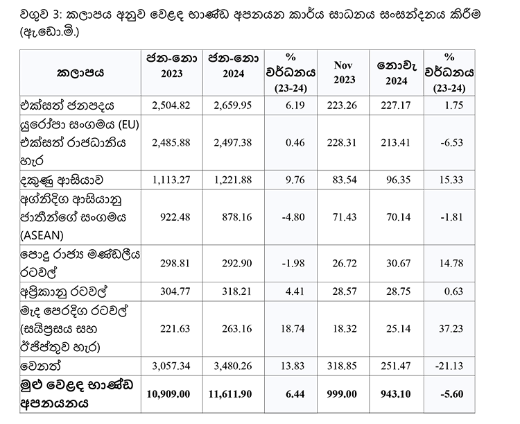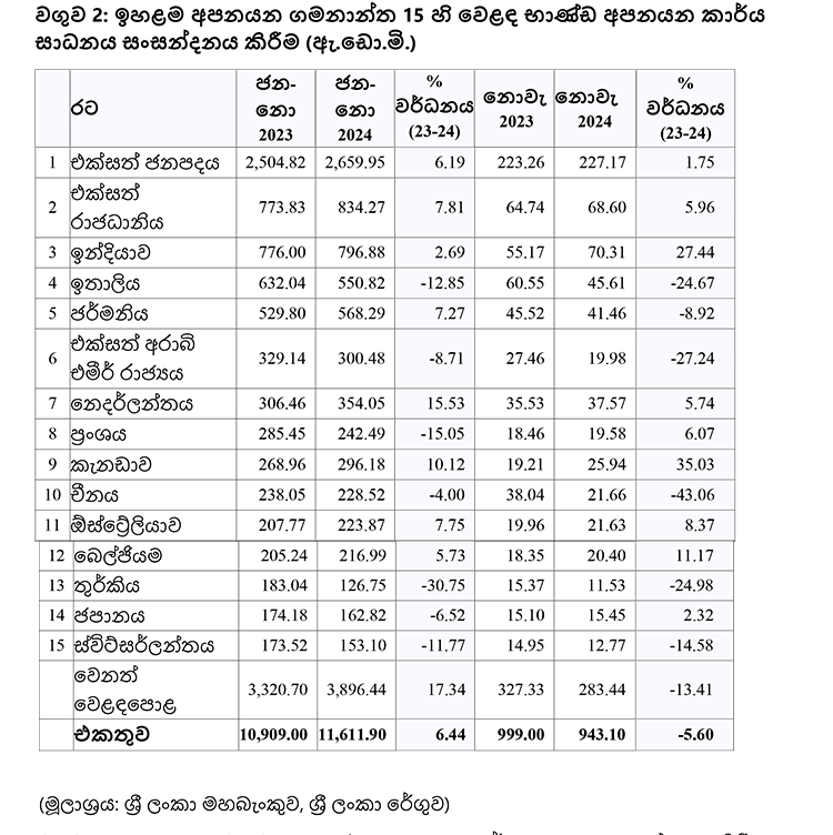 2024 නොවැම්බරයේ දී භාණ්ඩ අපනයන ආදායම 5.6%කින් පහළට