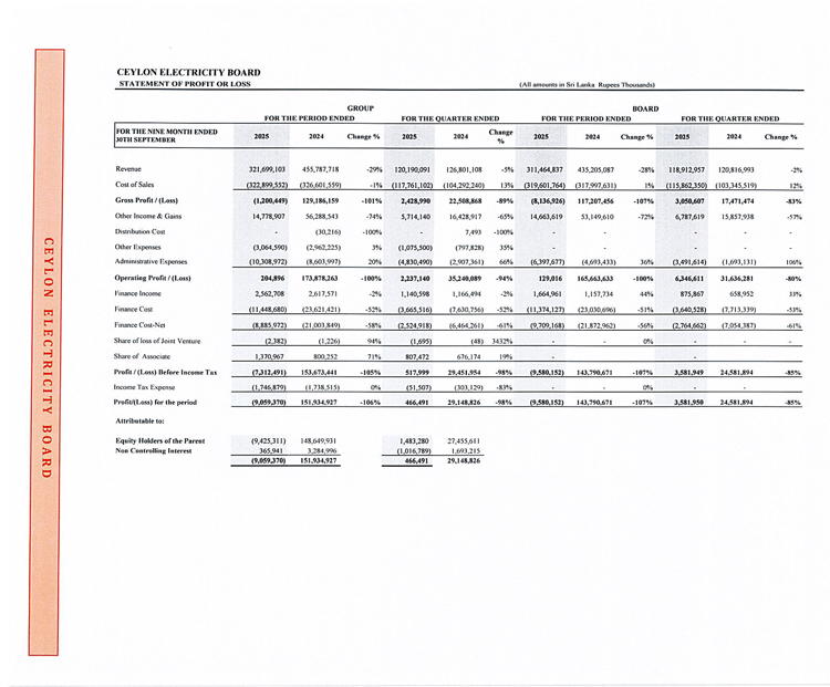 2025 සැප්තැම්බර් 30න් අවසන් මූල්‍ය කාර්තුව සඳහා ලංකා විදුලිබල මණ්ඩලයේ ලාභ අලාභ ප්‍රකාශය පහතින් දැක්වේ.