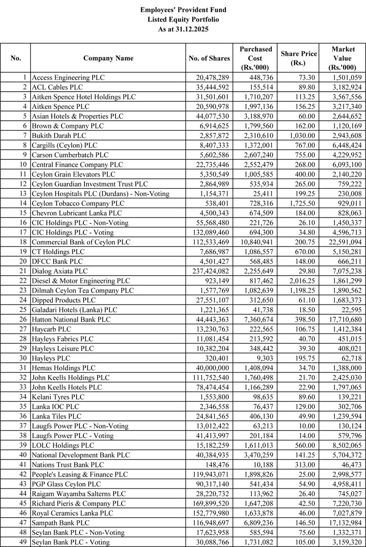 ඒ අනුව 2025 වසර අවසානයේ දී සමාගම් 59ක රු. බිලියන 77.94ක ආයෝජනයන් සේවක අර්ථසාධක අරමුදල විසින් සිදුකර ඇති අතර 2025 දෙසැම්බර් 31 දිනට ඒවායේ වෙළෙඳපොළ වටිනාකම රු. බිලියන 188.85ක් ලෙසින් වාර්තා වී තිබේ.