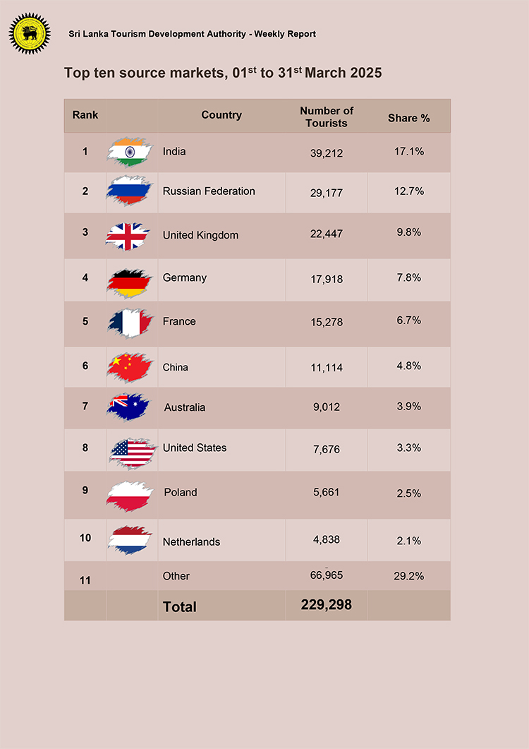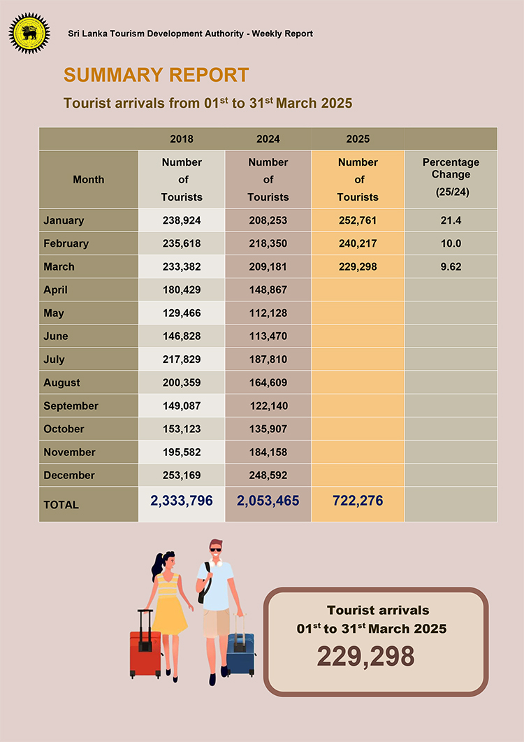 2025 වසරේ මාර්තු මාසය තුළ 229,298 ක සංචාරකයින් පිරිසක් මෙරටට පැමිණ ඇති බව ශ්‍රී ලංකා සංචාරක සංවර්ධන අධිකාරිය පවසයි.