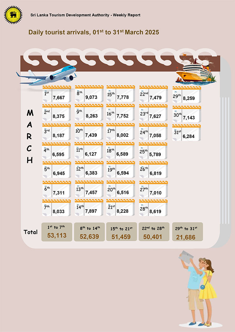 මාර්තු මාසයේ සෑම සතියකම 50,000 ඉක්ම වූ සංචාරක පැමිණීමක් වාර්ත ඇති අතර 8,619ක ඉහළම සංචාරක පැමිණීම මාර්තු 28වන දින වාර්තා වී ඇත.