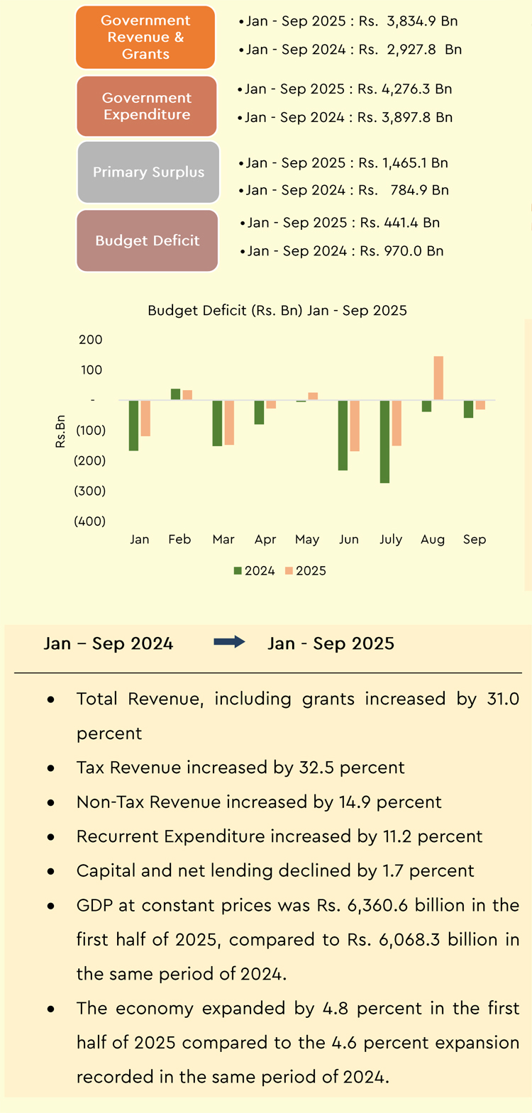 2025 ජනවාරි - සැප්තැම්බර් කාලපරිච්ඡේදය සඳහා වන රාජ්ය මූල්ය සමාලෝචන වාර්තාව නිකුත් කර තිබේ. මුදල්, ක්රමසම්පාදන හා ආර්ථික සංවර්ධන අමාත්යාංශයේ ෆිස්කල් ප්රතිපත්ති දෙපාර්තමේන්තුව විසින් නිකුත් කර ඇති මෙම නවතම වාර්තාවට අනුව 2025 ජනවාරි - සැප්තැම්බර් කාලපරිච්ඡේදය අවසානයේ දී අයවැය හිඟය රු. බිලියන 441.4ක් ලෙසින් සටහන්ව ඇත.