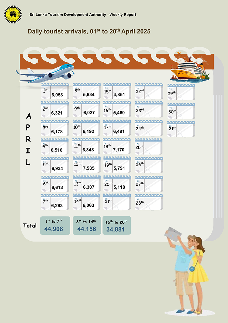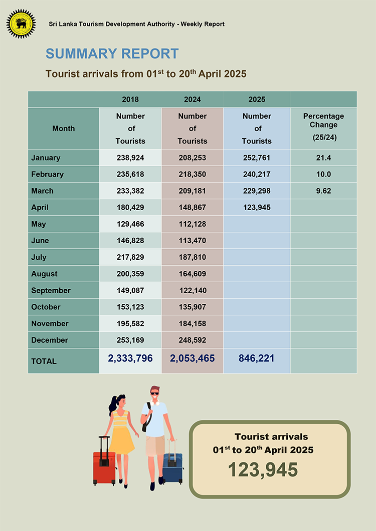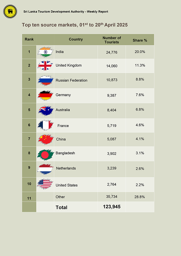 ඔවුන් සිය නවතම දත්ත වාර්තාවන් නිකුත් කරමින් පෙන්වා දෙන්නේ අප්‍රේල් මාසයේ පළමු දින 20 තුළ දී 123,945ක සංචාරකයින් පිරිසක් මෙරටට පැමිණ ඇති බවයි.