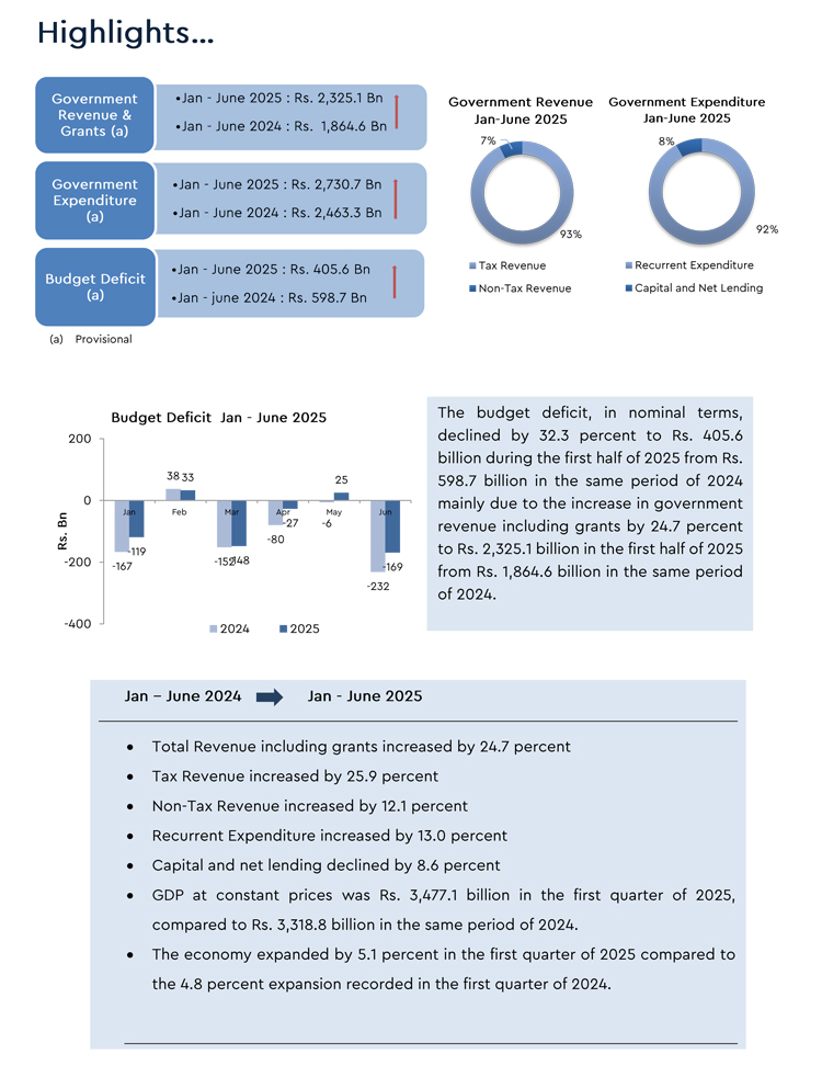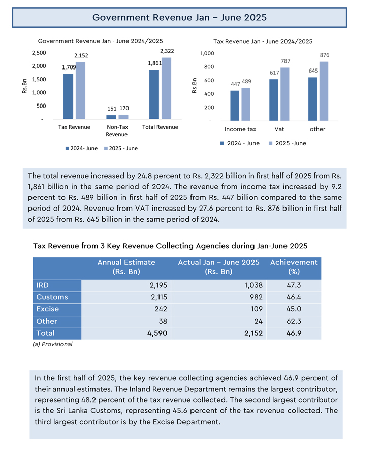 2024 මුල් භාගයේ දී රු. බිලියන 1,709ක්වූ බදු ආදායම 2025 පළමු භාගය තුළ රු. බිලියන 2,152ක් දක්වාත්, රු. බිලියන 151 ක් ලෙසින් වාර්තා වී ඇති බදු නොවන ආදායම රු. බිලියන 170ක් දක්වා ත් එහිදී ඉහළ ගොස් ඇත.