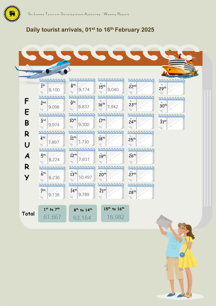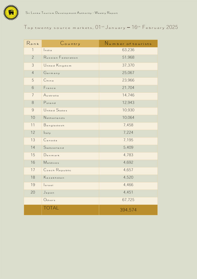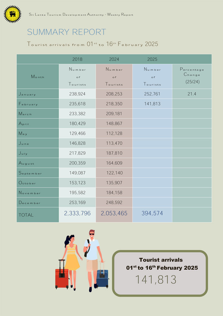 ශ්රී ලංකා සංචාරක සංවර්ධන අධිකාරිය විසින් අවසන් වරට නිකුත් කර ඇති නිල සංඛ්යාලේඛනවලට අනුව 2025 පෙබරවාරි 16 දින දක්වා මෙරටට පැමිණ ඇති සමස්ත සංචාරකයින් සංඛ්යාව 394,574 ක් වේ. ඊට සමගාමීව අද (20) දින දක්වා මෙරටට පැමිණ ඇති සංචාරකයින් සංඛ්යාව 400,000 සීමාව ඉක්මවා යාමට හැකිව ඇති බව ආරංචි මාර්ග සඳහන් කරයි.