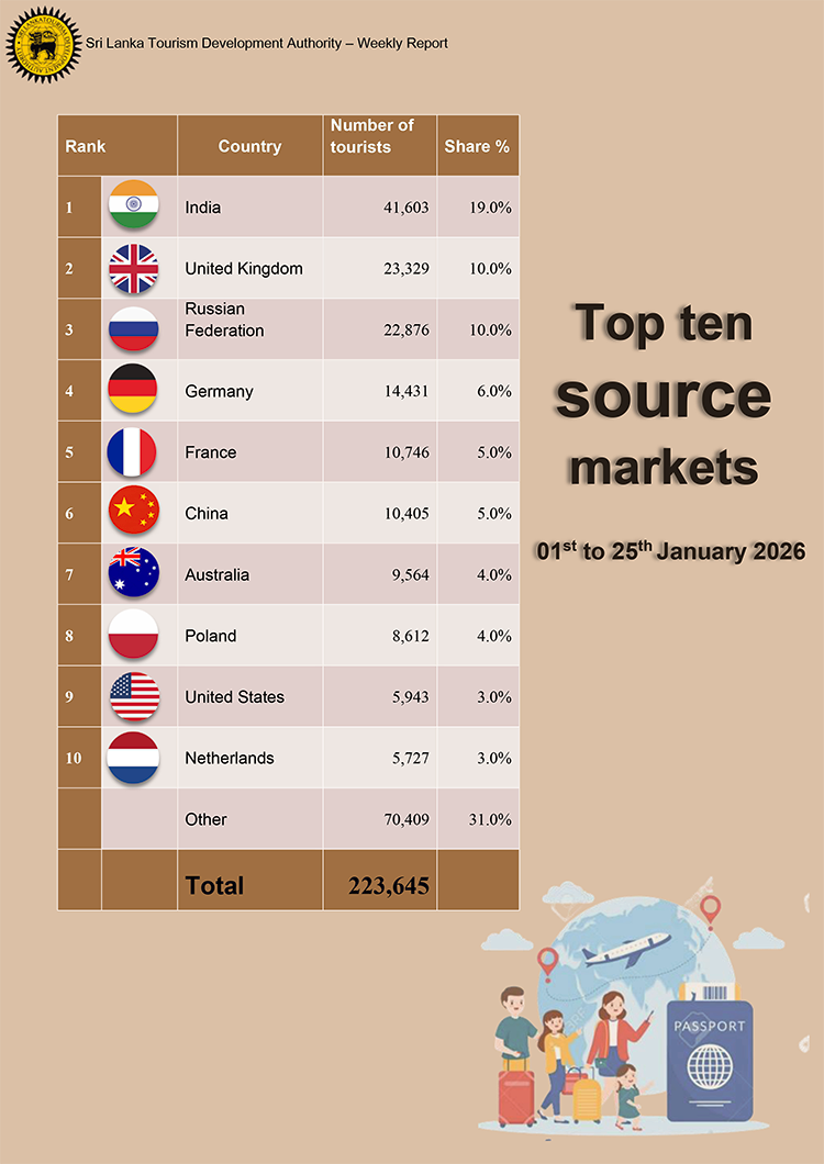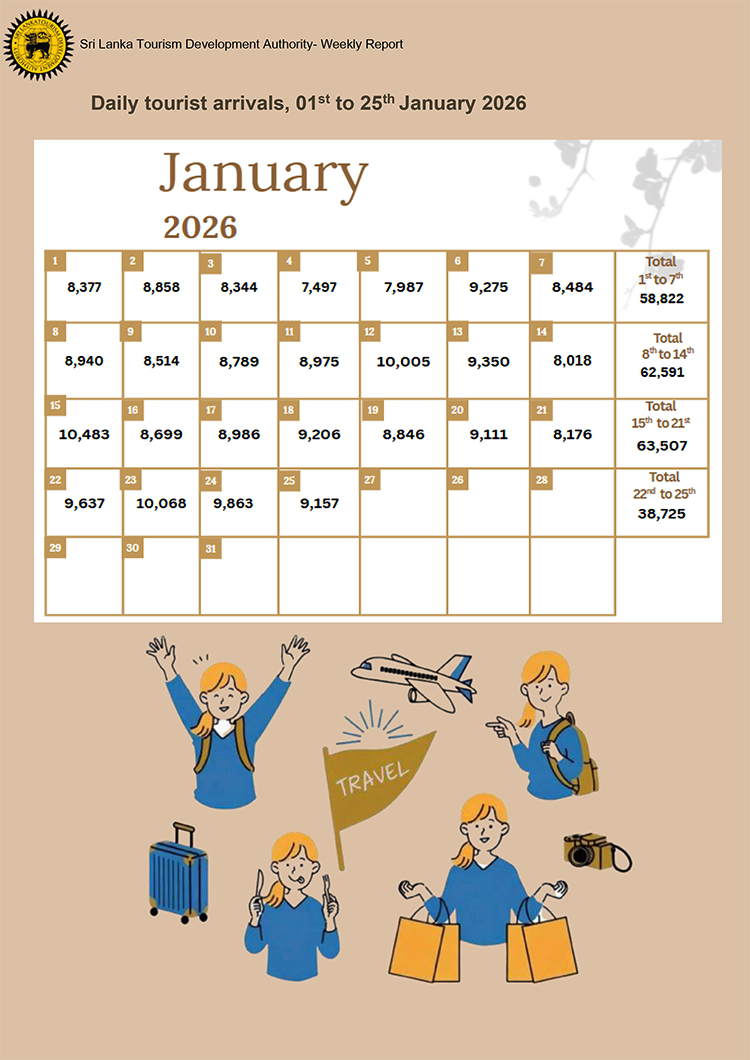 2026 වසරේ ගත වූ පළමු දින 25 තුළ 223,645ක සංචාරකයින් පිරිසක් මෙරටට පැමිණ ඇති බව ශ්රී ලංකා සංචාරක සංවර්ධන අධිකාරිය පවසයි.