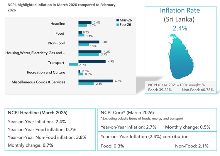 ජාතික පාරිභෝගික මිල දර්ශකයට (NCPI) අනුව 2026 අප්‍රේල් මාසයේ මෙරට ලක්ෂ්‍යමය මතුපිට උද්ධමනය 2.4% ක් දක්වා ඉහළ ගොස් ඇත. 2026 පෙබරවාරි මාසයේ දී මෙම අගය 1.6%ක් ලෙස වාර්තා වී තිබුණි.