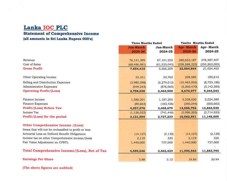 මේ සමඟම 2025/26 මූල්ය වර්ෂය වෙනුවෙන් රු. බිලියන 11.99ක බදු පසු ලාභයක් වාර්තා කිරීමට ලංකා IOC සමාගමට හැකි වී ඇත.