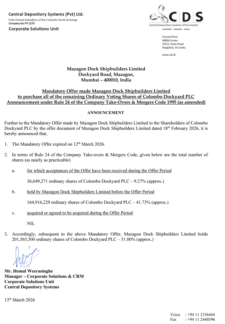 කොළඹ නැව්තටාකාංගන සමාගමේ (Colombo Dockyard PLC) 51%ක බහුතර කොටස් හිමිකාරීත්වය තහවුරු කර ගත් බව Mazagon Dock Shipbuilders Limited නිවේදනය කර සිටී.