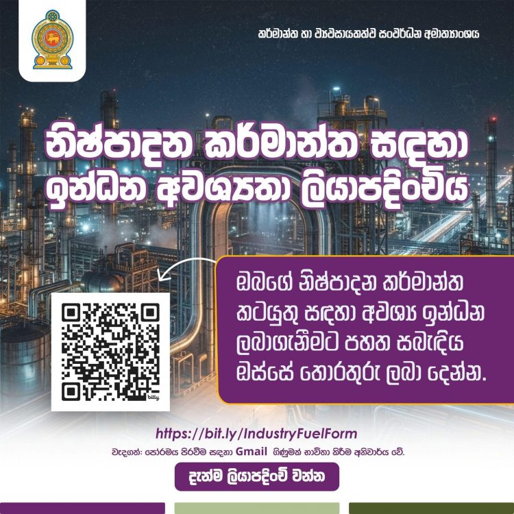 නිෂ්පාදන කර්මාන්ත කටයුතු අඛණ්ඩව පවත්වාගෙන යාම සඳහා අවශ්ය ඉන්ධන ලබාගැනීම සඳහා කර්මාන්ත හා ව්යවසායකත්ව සංවර්ධන අමාත්යාංශය විසින් ලබා දී ඇති https://bit.ly/IndustryFuelForm යන සබැඳිය ඔස්සේ කඩිනමින් ලියාපදිංචි වන ලෙස එම අමාත්යාංශය පවසයි.ෙ