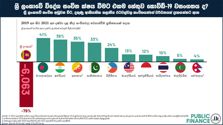 ශ්රී ලංකාවේ භාවිතා කළ හැකි විදේශ සංචිත 2019 දී ඩොලර් මිලියන 7,642 සිට 2021 අවසානය වන විට ඩොලර් මිලියන 1,579 දක්වා පහත වැටී ඇත. වසංගතය අතරතුර ශ්රී ලංකාවේ කලාපීය රටවල හා සසඳන විට, එසේ සංචිතවල පහත වැටීම සිදුවී ඇත්තේ ශ්රී ලංකාවේ පමණක් වන අතර, ආසියාතික රටවල සංචිතවල වැඩිවීමක් දක්නට ලැබේ.