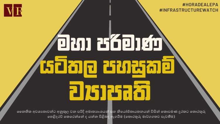 ජනතා මුදලින් ක්රියාත්මක වන මහා පරිමාණ සංවර්ධන ව්යාපෘතිවල තොරතුරු, ජනතාව වෙත කුමන ප්රමාණයන්වලින් නිදහස් කර ඇතිදැයි බලන වේදිකාවක් නිර්මාණය කිරීමට වෙරිටේ රිසර්ච් ආයතනය කටයුතු කර තිබේ. ‘යටිතල පහසුකම් විපරම’ යන මෙම වේදිකාව යටතේ 2019 සිට 2021 දක්වා කාලයේ රජයේ අනුමැතිය මත ශ්රී ලංකාවේ ක්රියාත්මක වෙමින් තිබෙන මහා පරිමාණ යටිතල පහසුකම් සංවර්ධන ව්යාපෘති 60ක තොරතුරු ජනතාව…