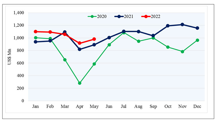 2022 මැයි මාසයේ ශ්රී ලංකාවේ අපනයන කාර්ය සාධනය 2022 මැයි මාසයේදී වෙළඳ භාණ්ඩ අපනයන ඉපැයීම් එක්සත් ජනපද ඩොලර් මිලියන 980.2 දක්වා 9.9% කින් පෙර වසරට සාපේක්ෂව වැඩි විය. මෙයට ප්රධාන වශයෙන් හේතු වූයේ ඇඟලුම් සහ රෙදිපිළි, පොල් ආශ්රිත නිෂ්පාදන සහ විදුලි සහ ඉලෙක්ට්රොනික සංරචක අපනයන ඉපැයීම් ඉහළ යාමයි. මාසික වෙළඳ භාණ්ඩ අපනයන කාර්ය සාධනය, 2020…