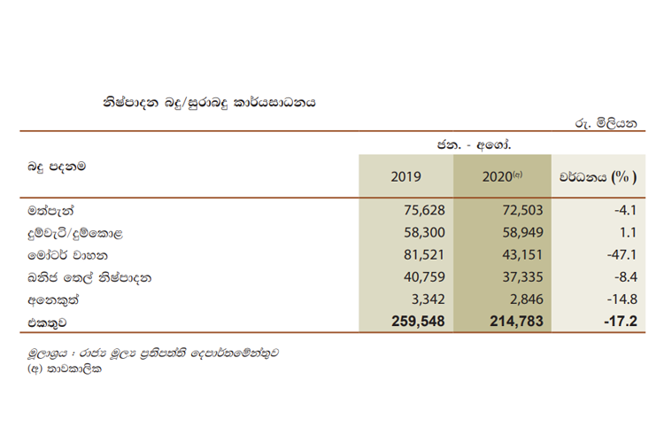 නිෂ්පාදන/සුරා බදු තුළින් ලද ආදායම මෝටර් වාහන හැර අනෙකුත් සියළුම අංශයන්ගෙන් ලද ආදායම් වැඩිවීමත් සමඟින් 2019 වසරේ සමාන කාලපරිච්ඡේදයේ දී වාර්තා වූ රු. බිලියන 94.6 ට සාපේක්ෂව 2020 වසරේ පළමු මාස තුන තුළ දී රු. බිලියන 105.6 දක්වා සියයට 11.6 කින් සැලකිය යුතු ලෙස වර්ධනය විය. කෙසේ වුවද, කොවිඞ්-19 වසංගතයෙහි බලපෑම පෙන්නුම් කරමින් 2020 වසරේ…