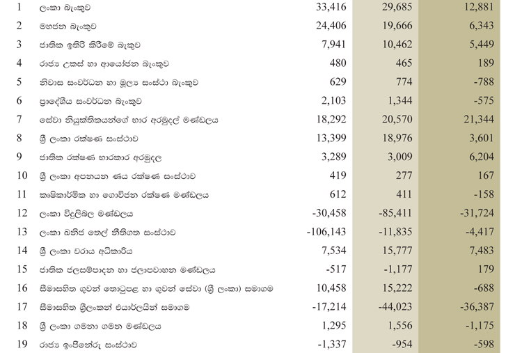 2020-21 රාජ්ය මූල්ය කළමනාකරණ වාර්තාවට අනුව 2020 අගෝස්තු 31 දිනට සීමාසහිත ශ්රීලංකන් එයාර්ලයින් සමාගම රු. මිලියන 36,387 ක් සහ ලංකා විදුලිබල මණ්ඩලය රු. මිලියන 31,724 ක් ලෙසින් පාඩු ලබා ඇති බව වාර්තා වේ. රජය සතු ව්යවසායයන් 52 ක ලාභදායීත්වය පිළිබඳ එම සටහනට අනුව රජයට වැඩිම ආදායමක් ලබා දී ඇති රාජ්ය ව්යවසාය වන්නේ සේවා නියුක්තිකයන්ගේ භාර…