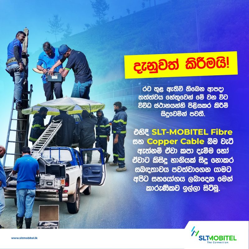 ශ්රී ලංකාවට මුහුණ දීමට සිදුවූ අයහපත් කාලගුණික තත්ත්වය හේතුවෙන් ගස් කඩා වැටීම්, මහා මාර්ග අවහිරවීම් ඇතුළු බොහෝ හානි සිදුවීම් වාර්තා විය. මෙම මහා මාර්ග, ගස් අතු, සහ වෙනත් බාධක ඉවත් කරමින් හා ශුද්ධ පවිත්ර කරමින් ජන ජීවිතය යථා තත්ත්වයට ගැනීමට සහාය ලබාදෙන අපගේ වටිනා ශ්රම බලකාය වෙත SLT-MOBITEL විසින් විශේෂ ඉල්ලීමක සිදු කරයි. ඔබට දක්නට…