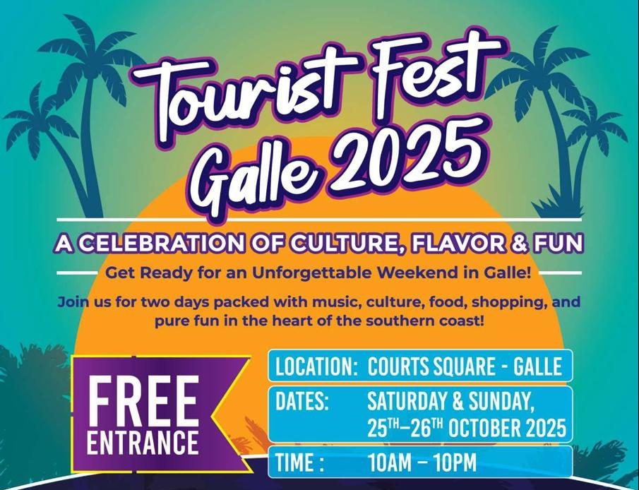 ශ්රී ලංකාවේ සංස්කෘතිය, නිර්මාණශීලිත්වය සහ ප්රජාව පිළිබඳ විචිත්රවත් සැමරුමකට සූදානම් වන්න! ශ්රී ලංකා සංචාරක ප්රවර්ධන කාර්යංශය විසින් සංවිධානය කරන “Tourist Fest – Galle 2025” ඔක්තෝබර් 25 සහ 26 යන දෙදින තුළ ගාල්ල උසාවි චතුරශ්රයේදී පැවැත්වීමට කටයුතු සංවිධානය කර ඇත. එහි දී, සාම්ප්රදායික සංගීත සහ නර්තන සංදර්ශන, ශ්රී ලාංකාවට ආවේනික වූ ආහාර පාන, විශිෂ්ට දේශීය අත්කම්…