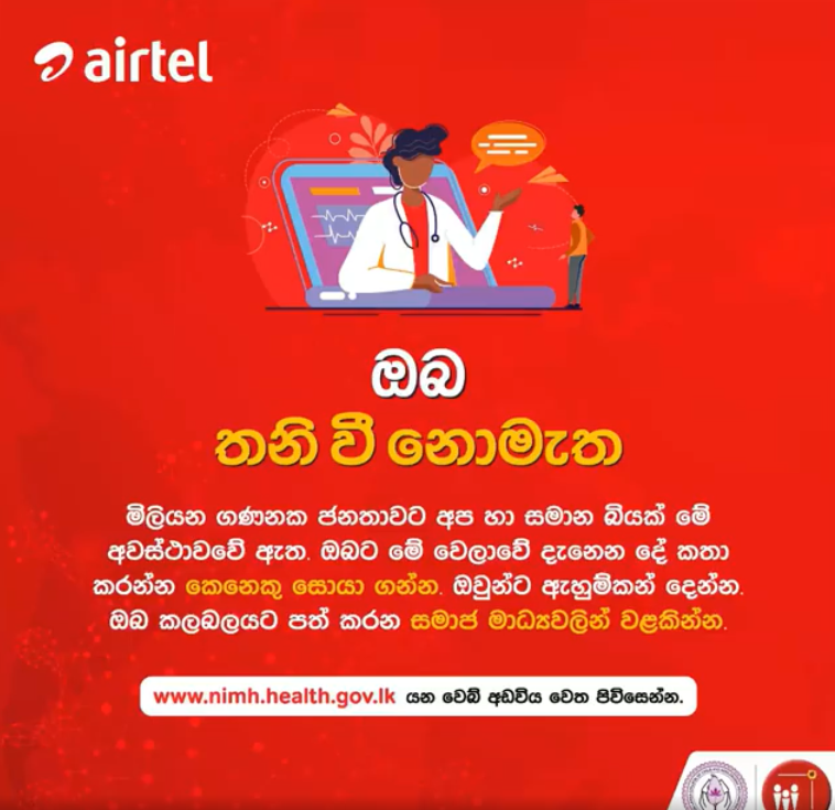 වර්තමානයේ COVID-19 වැනි වසංගතවලින් මානසික සෞඛ්යයට බලපෑම් ඇති විය හැකිය. මෙවැනි පීඩාකාරී කාලවලදී යහපැවැත්ම පවත්වා ගැනීමට සහාය වීම හා කළමනාකරණය කිරීම සඳහා එයාර්ටෙල් ලංකා සමාගම, ජාතික මානසික සෞඛ්ය විද්යායතනය (NIMH)සමඟ එක්ව ඔබගේ මානසික සෞඛ්යය පිළිබඳ දැනුවත්භාවය ඉහළ නැංවීම සඳහා වැඩසටහන් ගණනාවක් දියත් කර ඇති බව නිවේදනය කර ඇත. මෙවැනි අර්බුදකාරී කාලවලදී මතු විය හැකි පොදු…
