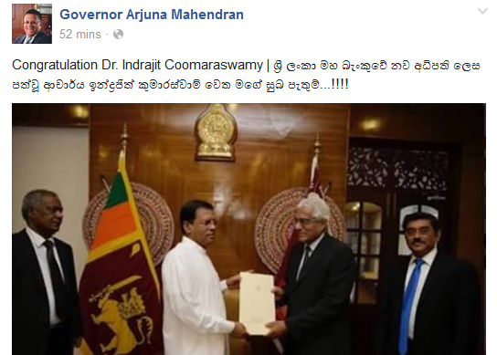 ශ්රී ලංකා මහ බැංකුවේ හිටපු අධිපති අර්ජුන මහේන්ද්රන් මහතා නව අධිපති ආචාර්ය ඉන්ද්රජිත් කුමාරස්වාමි මහතාට සුභ පතා තිබේ. සිය ෆේස්බුක් ගිණුම ඔස්සේ හිටපු මහ බැංකු අධිපතිවරයා මෙලෙස නව අධිපතිවරයාට සුභ පැතුම් එක් කර ඇත.