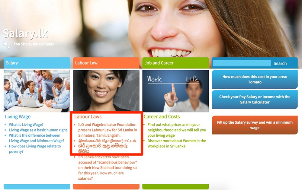 ශ්රී ලංකාව තුළ ශ්රමිකයන්ගේ අයිතිවාසිකම් හා වගකීම් පිළිබඳව දැනුවත්භාවය වැඩිකිරීම සඳහා මෙරට කම්කරු නීති සංග්රහයේ සිංහල හා දෙමළ පරිවර්තන salary.lk වෙබ් අඩවියට ඇතුළත් කළ බව ජාත්යන්තර කම්කරු සංවිධානය (International Labor Organization-ILO) පසුගියදා නිවේදනය කළේ ය. වේජ්ඉන්ඩිකේටර් පදනම (WageIndicator Foundation) විසින් පවත්වාගෙන යනු ලබන මෙම වෙබ් අඩවිය ශ්රී ලංකාවේ කම්කරු නීතිය පිළිබඳව තොරතුරු සරල බසින් ඉදිරිපත්…