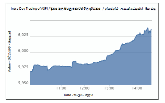 අද දින ගනුදෙනු අවසානයේ දී කොළඹ කොටස් වෙළෙඳපොළ සියලු කොටස් මිල දර්ශක ඒකක 50.97 කින් ඉහළ ගිය අතර යළිත් වරක් ඒකක 6,000 සීමවා ඉක්මවා යාමට ඊට අවස්ථාව ලැබිණි. මෙය පෙර දිනයට සාපේක්ෂව 0.85% ක වර්ධනයක් වන අතර දිනය අවසානයේ දී සියලු කොටස් මිල දර්ශක අගය ඒකක 6,021.37 ක් ලෙසින් සටහන් විය. සුපුරුදු පරිදි අද දින…