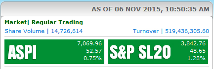 අද උදෑසන කොළඹ කොටස් වෙළෙඳපොළ දෛනික ගනුදෙනු වඩාත් සක්රීය අයුරින් සිදු වෙමින් පැවති අතර පෙරවරු 10.50 වන විට ඒකක 52 කින් සියලු කොටස් මිල දර්ශක අගය ඉහළ ගොස් තිබිණ. ඒ වන විට සියලු කොටස් මිල දර්ශක අගය ඒකක 7,069.96 ක් ලෙසින් වාර්තා විය. එසේම මිලියන 500 ක් ඉක්මවූ පිරිවැටුමක් ගනුදෙනු සිදු වූ මුල් පැය එකහමාරක…
