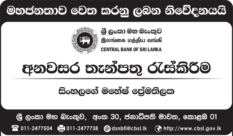 අරණායක පදිංචිකරුවකු වන සිංහලගේ මහේෂ් ප්රේමතිලක නැමැත්තා 2011 අංක 42 දරන මුදල් ව්යාපාර පනතෙහි ප්රතිපාදනයන් උල්ලංඝනය කරමින් අනවරස තැන්පතු භාරගත් බවට නිශ්චය කර ඇති බව ශ්රී ලංකා මහ බැංකුව පවසයි. ඒ අනුව, මෙම පුද්ගලයාට ණය ගිවිසුම්/ පොරොන්දු පත්ර නිකුත් කිරීම මගින් හෝ වෙනත් කිසිදු ආකාරයකින් මහජනතාවගෙන් තැන්පතු භාරගැනීම සිදු නොකළ යුතු බව සහ ඔහු විසින්…
