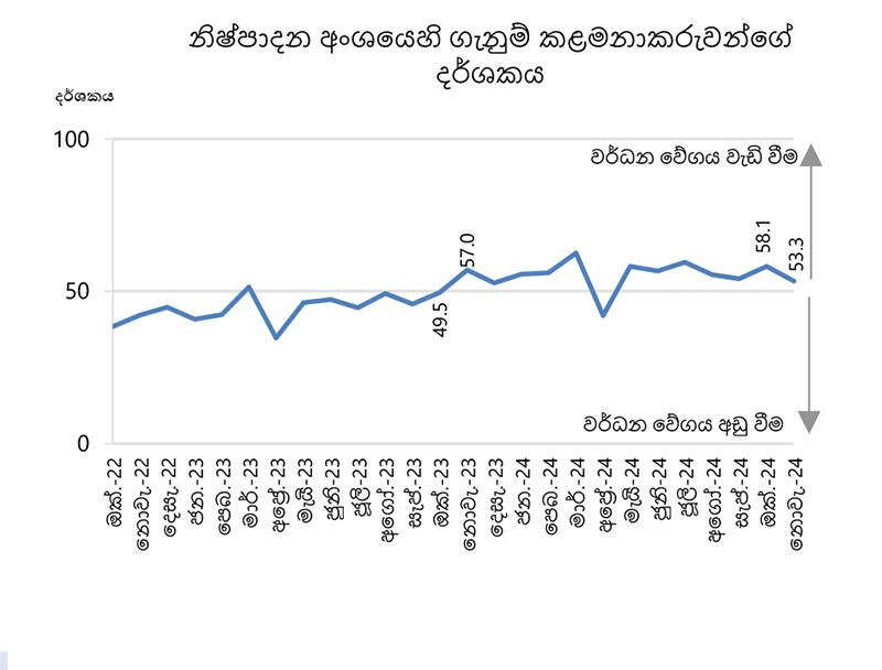 2024 නොවැම්බර් මාසයේ ගැනුම් කළමනාකරුවන්ගේ දර්ශක මගින් නිෂ්පාදන හා සේවා ක්රියාකාරකම්වල වර්ධනයක් පෙන්නුම් කරයි නිෂ්පාදන අංශයේ ශ්රී ලංකා ගැනුම් කළමණාකරුවන්ගේ දර්ශකය 2024 නොවැම්බර් මාසයේදී 53.3 ක දර්ශක අගයක් වාර්තා කළේය. මෙමගින් පසුගිය මාසයට සාපේක්ෂව නිෂ්පාදන කටයුතුවල වර්ධනයක් පෙන්නුම් කරන අතර, ඒ සඳහා සියලුම උප දර්ශක ධනාත්මක දායකත්වයක් ලබා දුන්නේය. නොවැම්බර් මාසයේදී නව ඇණවුම් ඉහළ යෑම…