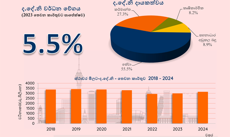 ජනලේඛන හා සංඛ්යාලේඛන දෙපාර්තමේන්තුව විසින් 2024 වර්ෂයේ තෙවන කාර්තුව (ජූලි 01 සිට සැප්තැම්බර් 30 දක්වා) සඳහා නිෂ්පාදන ප්රවේශය යටතේ පවත්නා මිල ගණන් සහ ස්ථාවර මිල (2015) ගණන් යටතේ දළ දේශීය නිෂ්පාදිතය සහ අනෙකුත් සාර්ව ආර්ථික දර්ශක ඇස්තමේන්තු කර ප්රකාශයට පත් කොට ඇත. 2023 වර්ෂයේ තෙවන කාර්තුවේ ස්ථාවර මිල (2015) ගණන් යටතේ රුපියල් මිලියන 2,987,544 ක්…