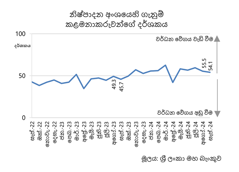 2024 සැප්තැම්බර් මාසයේ ගැනුම් කළමනාකරුවන්ගේ දර්ශක මගින් නිෂ්පාදන හා සේවා ක්රියාකාරකම්වල වර්ධනයක් පෙන්නුම් කරයි. නිෂ්පාදන අංශයේ ශ්රී ලංකා ගැනුම් කළමණාකරුවන්ගේ දර්ශකය 2024 සැප්තැම්බර් මාසයේ දී දර්ශකාංක 54.1ක් වාර්තා කළේය. එමගින් පසුගිය මාසයට සාපේක්ෂව අඩු වේගයකින් වුව ද නිෂ්පාදන ක්රියාකාරකම්වල වර්ධනයක් පිළිබිඹු කරයි. මෙහිදී, සේවා නියුක්තිය හැර අනෙකුත් සියලුම උප දර්ශක කඩයිම් මට්ටමට වඩා ඉහළ අගයක…