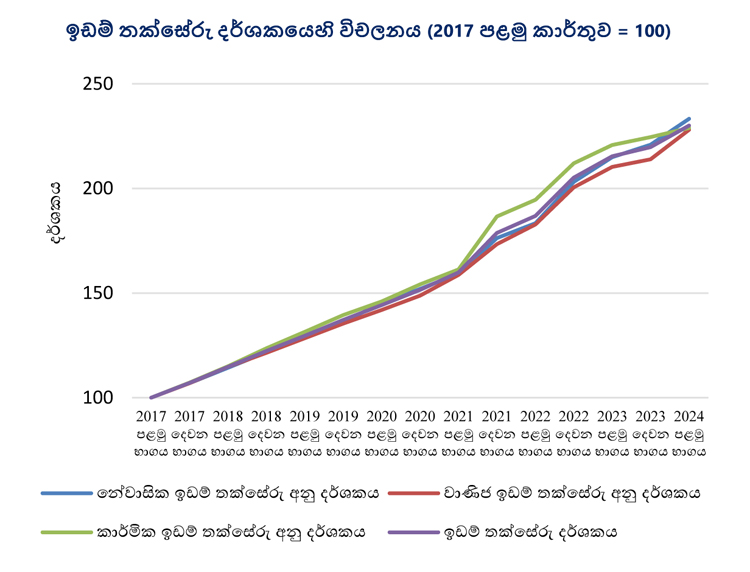 කොළඹ දිස්ත්රික්කයෙහි ඉඩම් තක්සේරු දර්ශකය 2024 වසරේ පළමු භාගයේ දී වාර්ෂික ලක්ෂ්යමය පදනම මත සියයට 6.9 ක වැඩි වීමක් වාර්තා කරන ලදී. මේ සඳහා නේවාසික, වාණිජ හා කාර්මික යන අනු දර්ශක තුනම පිළිවෙළින් සියයට 8.5ක, 8.5ක සහ 3.7ක වාර්ෂික වර්ධනයන් වාර්තා කරමින් දායක වන ලදී. අර්ධ වාර්ෂික පදනමින් ඉඩම් තක්සේරු දර්ශකය සහ එහි අනු දර්ශක…