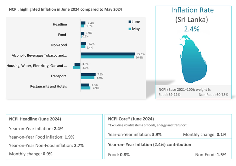 ජාතික පාරිභෝගික මිල දර්ශකයට (NCPI) අනුව මෙරට ලක්ෂ්යමය මතුපිට උද්ධමනය 2024 මැයි මාසයේ දී වාර්තා වූ 1.6% සිට 2024 ජූනි මාසයේ දී 2.4% ක් දක්වා ඉහළ ගොස් ඇති බව ජනලේඛන හා සංඛ්යාලේඛන දෙපාර්තමේන්තුව නිවේදනය කර සිටී. එහිදී 2024 මැයි මාසයේ දී 0.5% ක්ව පැවති ආහාර කාණ්ඩයේ වාර්ෂික ලක්ෂ්යමය උද්ධමනය, 2024 ජූනි මාසයේ දී 1.9% ක්…