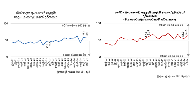 නිෂ්පාදන ක්රියාකාරකම්වල වර්ධනයක් පිළිබිඹු කරමින්, නිෂ්පාදන අංශයේ ශ්රී ලංකා ගැනුම් කළමණාකරුවන්ගේ දර්ශකය 2024 ජුනි මාසයේ දී දර්ශකාංක 56.6ක් වාර්තා කළේය. සේවා නියුක්තිය හැර අනෙකුත් සියලුම උප දර්ශක ජුනි මාසය තුළ දී කඩඉම් මට්ටමට වඩා ඉහළ අගයක පැවතුණි. නව ඇණවුම් සහ නිෂ්පාදන උප දර්ශකවල ඉහළ යෑම සඳහා ප්රධාන වශයෙන් ආහාර සහ පාන වර්ග නිෂ්පාදන අංශයේ වර්ධනය…