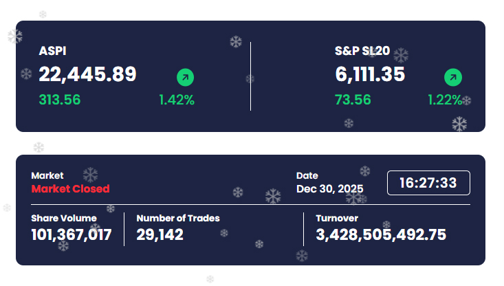 කොළඹ කොටස් වෙළෙඳපොළ ප්රධාන මිල දර්ශකයන් හි කැපීපනෙන වර්ධනයක් අද (30) දිනයේ දී වාර්තා විය. එහිදී සියලු කොටස් මිල දර්ශක අගය ඒකක 313.56කින් ඉහළ ගොස් දිනයේ ගනුදෙනු අවසානයේ දී ඒකක 22,445.89ක් ලෙසින් සටහන් වූ අතර S&P SL20 දර්ශකය ඒකක 73.56කින් ඉහළ ගොස් ගනුදෙනු අවසානයේ දී ඒකක 6,111.35ක් ලෙසින් වාර්තා වුණි. රු. බිලියන 3.42 ක ගනුදෙනු…