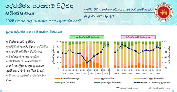 2025 වසරේ දෙවන භාගය සඳහා සිදු කරන ලද පද්ධතිමය අවදානම් පිළිබඳ සමීක්ෂණයේ මූලික නිරීක්ෂණ ශ්රී ලංකා මහ බැංකුව විසින් නිකුත් කර ඇත. මෙම ප්රකාශනය මගින් වෙළඳපොළ සහභාගීවන්නන් තුළ මූල්ය පද්ධතිය කෙරෙහි පවතින විශ්වාසය, මූල්ය පද්ධතියට බලපෑම් ඇති කළ හැකි අවදානම් මූලාශ්ර සහ එවැනි අවදානමක් හට ගැනීම පිළිබඳ ඔවුන්ගේ අපේක්ෂාවන් හි නිරීක්ෂණ සංක්ෂිප්තයක් ඉදිරිපත් කෙරේ. මෙහි…