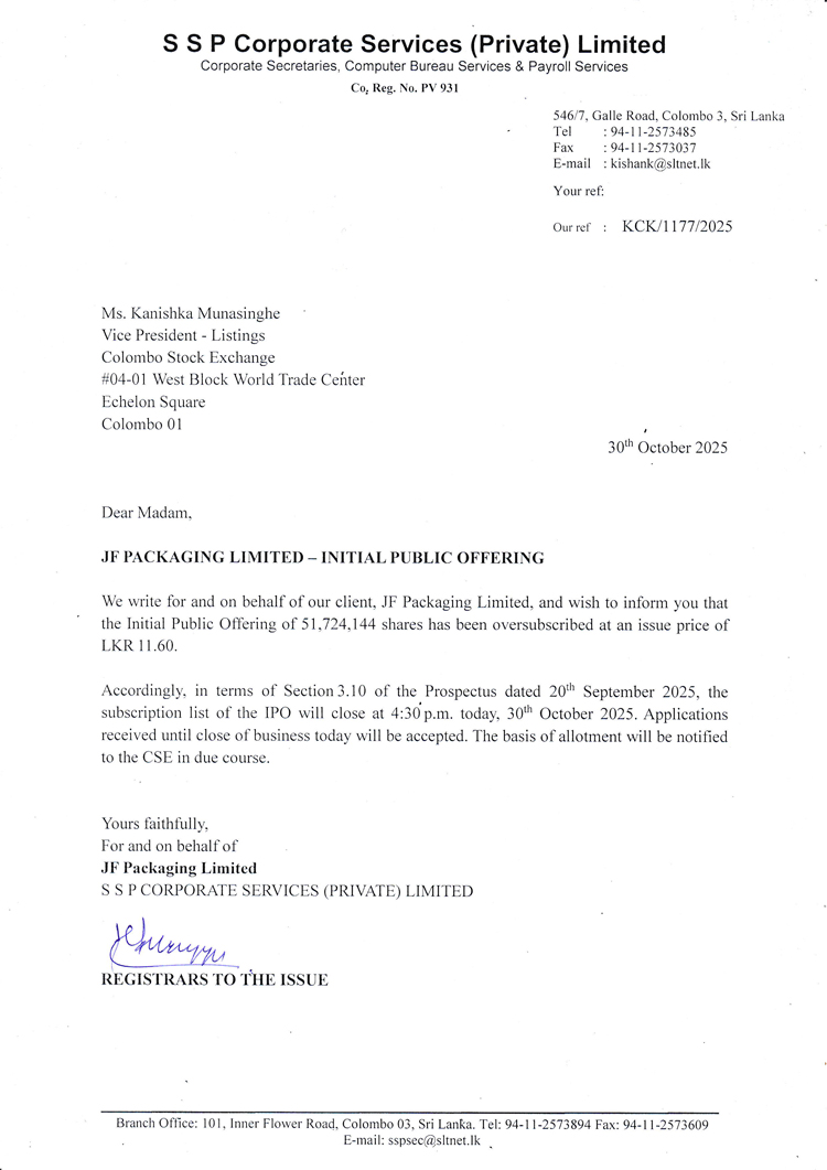 අද (30) විවෘත වූ JF පැකේජින් සමාගමේ මූලික මහජන කොටස් නිකුතුව සඳහා අධිදායකත්වයක් ලැබී ඇති බව එම නිකුතුවේ රෙජිස්ට්රාර් සමාගම වන SSP කෝපරේට් සර්විසස් (පුද්) සමාගම දැනුම් දී සිටී.