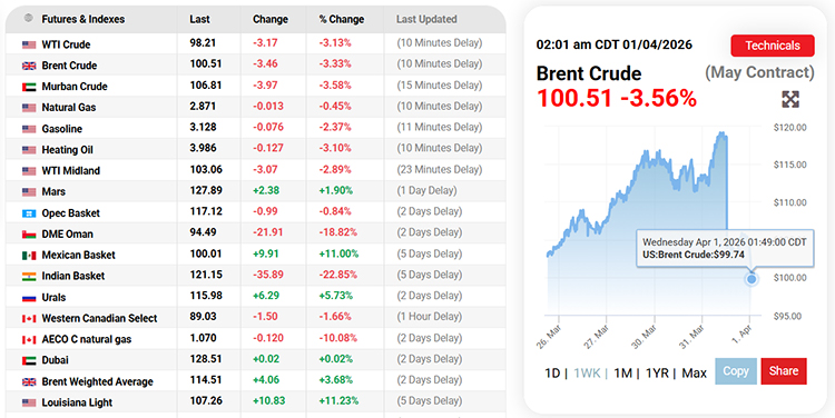 ශ්‍රී ලංකා වේලාවෙන් අද (01) මධ්‍යහ්නය වන විට ගෝලීය ඉන්ධන මිල ගණන් හි පහළ යාමක් වාර්තා වී ති‌බේ. ඒ අනුව බ්‍රෙන්ට් බොරතෙල් බැරලයක මිල ඩොලර් 100 මට්ටමින් පහළට පැමිණ ඇති බව නිරීක්ෂණය කළ හැකි වූ අතර WTI බොරතෙල් බැරලයක මිල ඩොලර් 98 මට්ටමට පැමිණ තිබුණි.