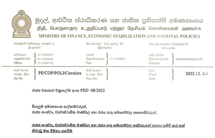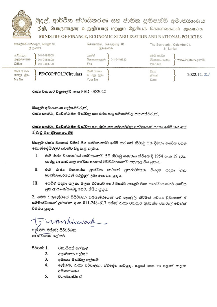සියලුම අමාත්යාංශ ලේකම්වරුන්, රාජ්ය සංස්ථා, ව්යවස්ථාපිත මණ්ඩල සහ රජය සතු සමාගම්වල සභාපතිවරුන් වෙත විශේෂ චක්රලේඛයක් නිකුත් කරමින් භාණ්ඩාගාර ලේකම්වරයා මේ බව දැනුම් දී ඇත.
