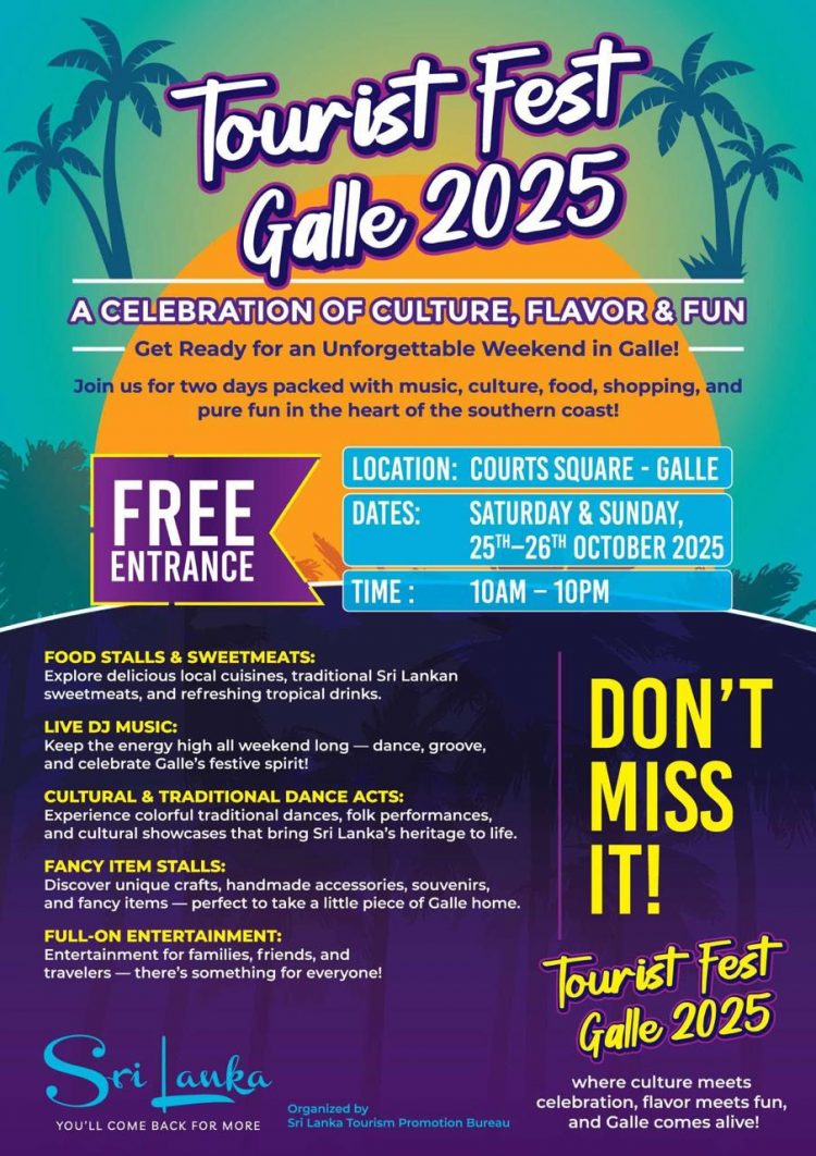 ශ්රී ලංකා සංචාරක ප්රවර්ධන කාර්යංශය විසින් සංවිධානය කරන "Tourist Fest – Galle 2025" ඔක්තෝබර් 25 සහ 26 යන දෙදින තුළ ගාල්ල උසාවි චතුරශ්රයේදී පැවැත්වීමට කටයුතු සංවිධානය කර ඇත.